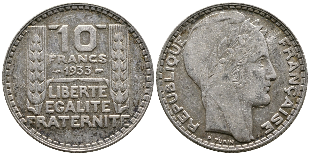 Франция 10 франков 1933 Пьер Тюрен KM 878, Le Franc 360.6 серебро 61-111