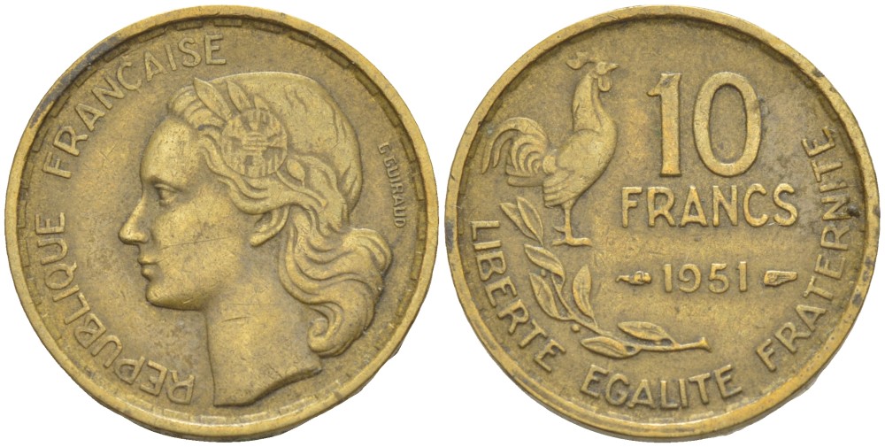 Франция 10 франков 1951 петух KM 915.1, Le Franc 363.4 алюминиевая бронза 4525-952