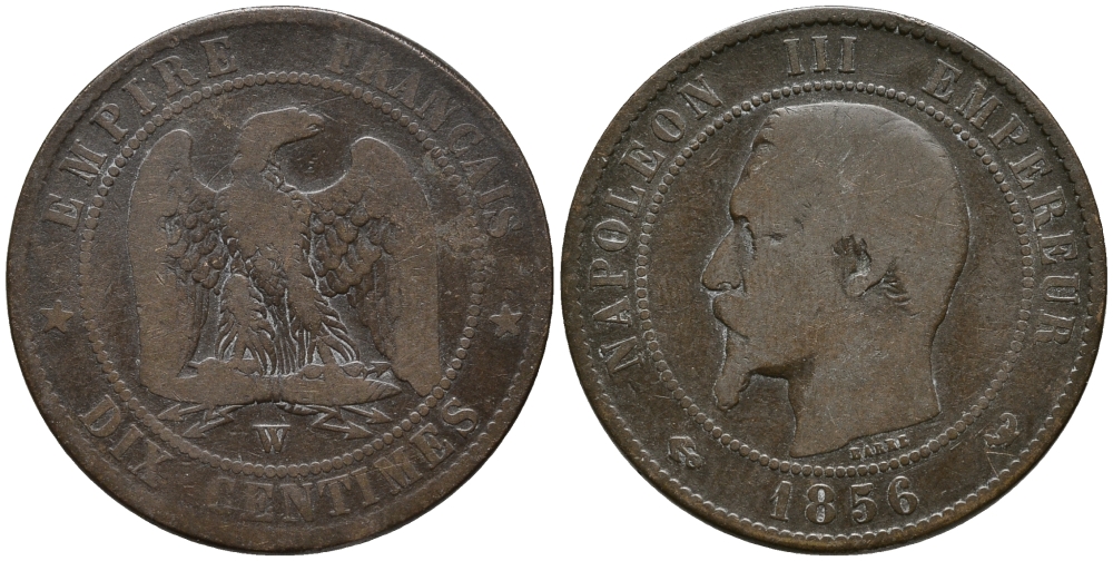 ФРАНЦИЯ 10 САНТИМОВ 1856 W, НАПОЛЕОН III (1852-1870) KM 771.7, LA FRANC 133.38 бронза 32-916