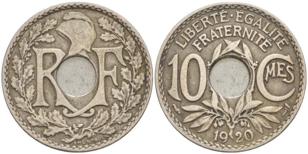 ФРАНЦИЯ 10 САНТИМОВ 1920 ТИП ЛИНДАЙЁ KM 866а, LE FRANC 138.4 медно-никель 4551-623
