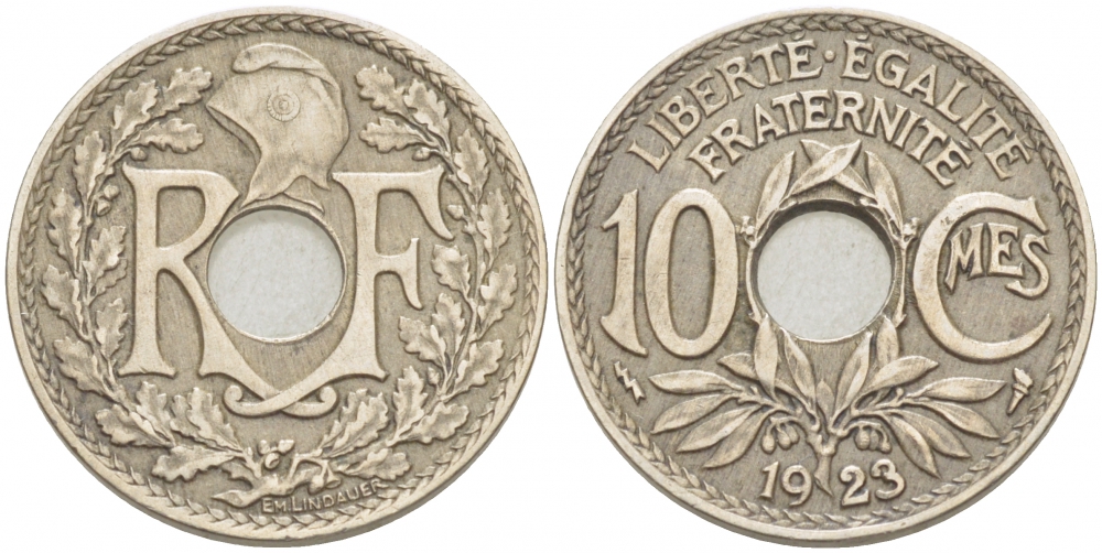 ФРАНЦИЯ 10 САНТИМОВ 1923 tb, ТИП ЛИНДАЙЁ, МОНЕТНЫЙ ДВОР ПУАССИ, МОЛНИЯ KM 866а, LE FRANC 138.9 медно-никель 4402-746