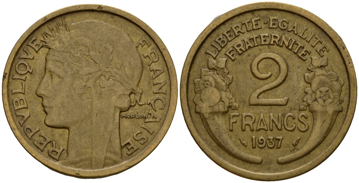 Франция 2 франка 1937 KM 886 алюминиевая бронза 4599-332