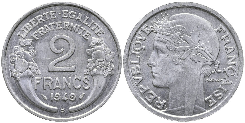 ФРАНЦИЯ 2 ФРАНКА 1949 В, ТИП МОРЛОН KM 886а.2, LE FRANC 269.15 алюминий аUNC 34-1151