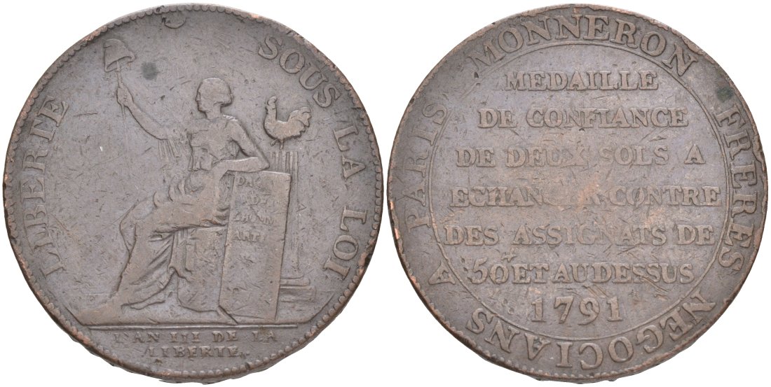 Франция 2 соля (су) 1791 LAN III, революции, токен, MONNERON FRERES NEGOCIANS A PARIS (Торговцы братья Моннерон. Париж) KM Tn23, Guilloteau 233 бронза 189-514