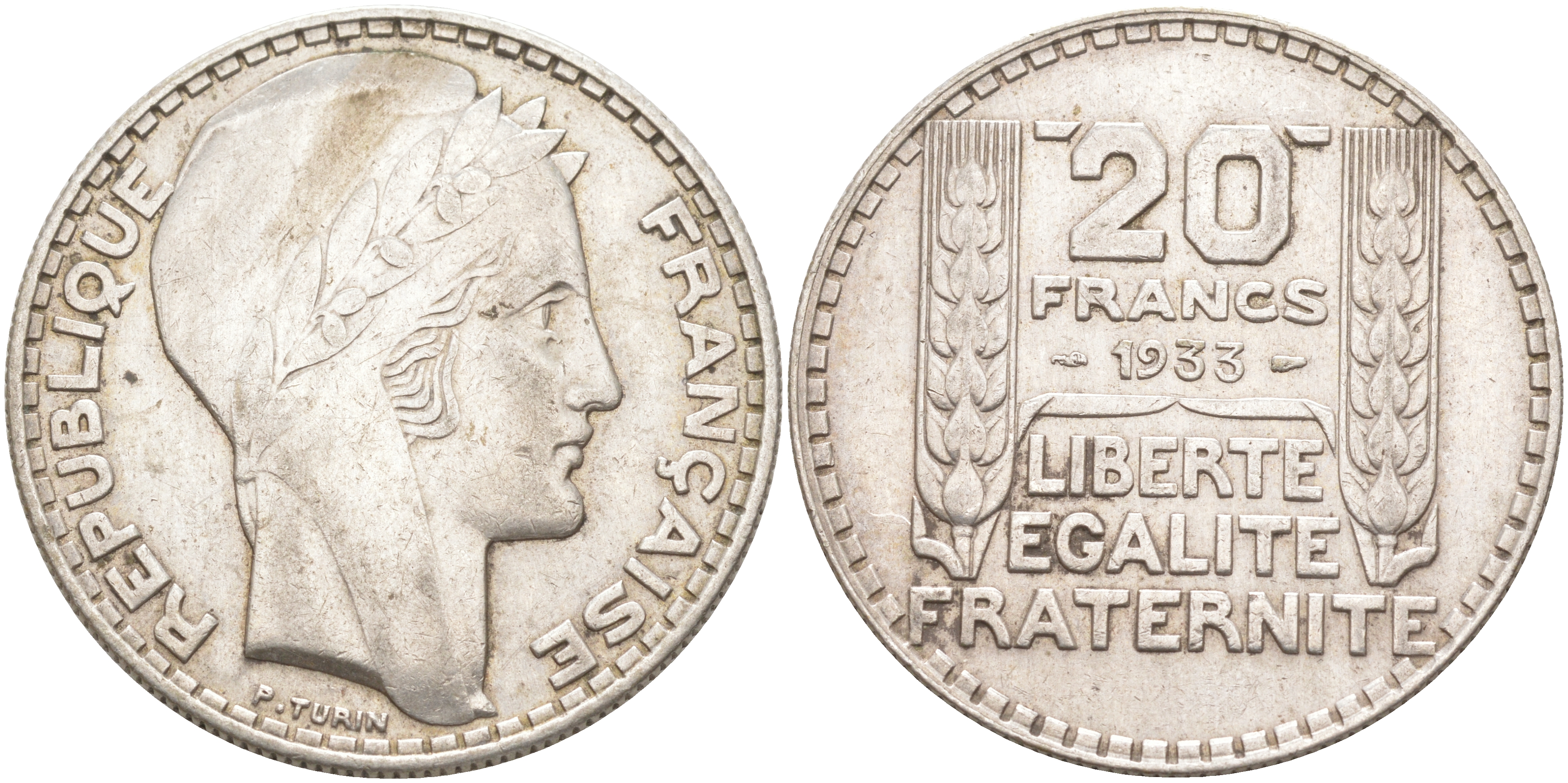Франция 20 франков 1933 Пьер Тюрен KM 879, Le Franc 400.3 серебро 443-733