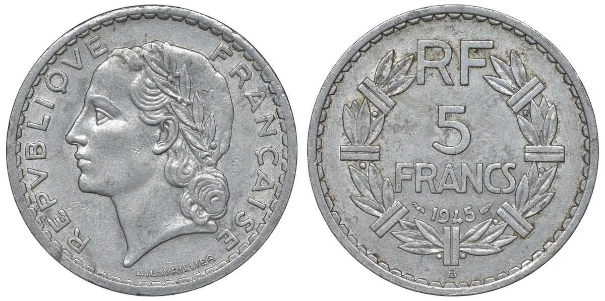 Франция 5 франков 1945 В, open 9 KM 888b.2, Le Franc 339.4 алюминий 4123-525