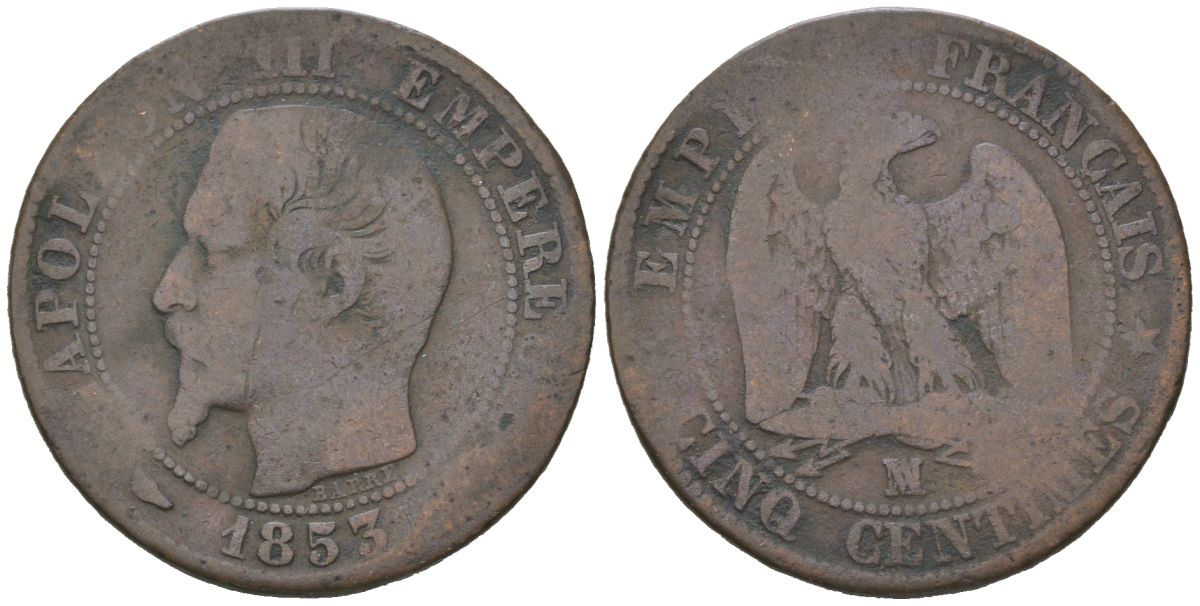 Франция 5 сантимов 1853 MA, Наполеон III (1852-1870), редкий монетный двор KM 777.6 бронза 4582-1236