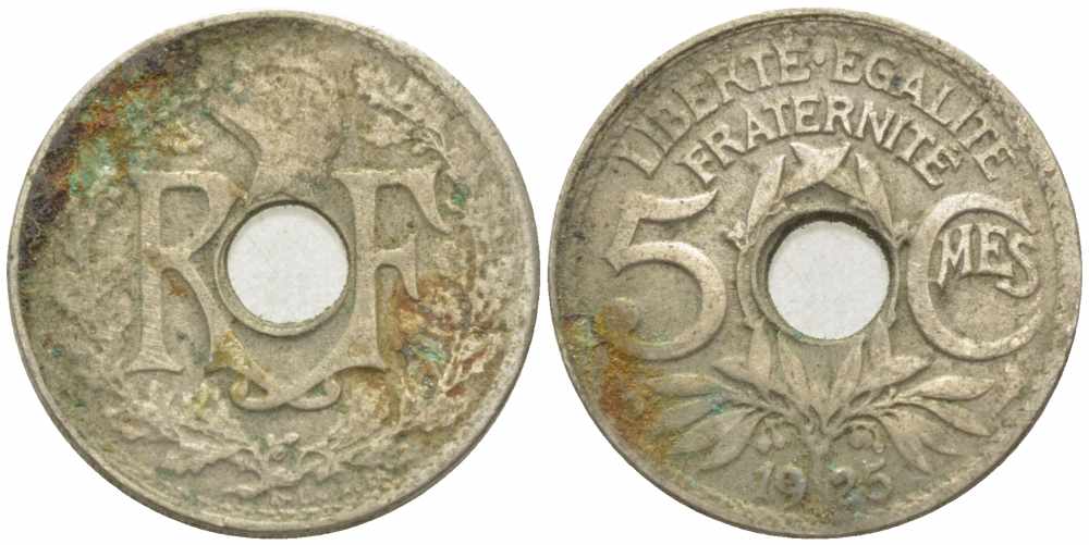 ФРАНЦИЯ 5 САНТИМОВ 1925 ТИП ЛИНДАЙЁ KM 875, LE FRANC 122.10 медно-никель 4379-344