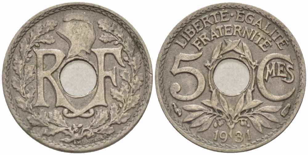 Франция 5 сантимов 1931 тип Линдайё KM 875, Le Franc 122.14 медно-никель 105-358