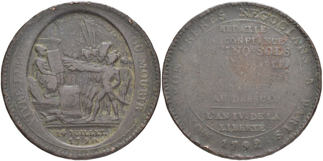 Франция 5 солей (су) 1792 LAN 4, революции, токен, VIVRE LIBRAS OU MOURIR ("Жить свободным или умереть", MONNERON FRERES NEGOCIANS A PARIS (Торговцы братья Моннерон. Париж). KM Tn31, Guilloteau 291, Mazard 145 бронза 4552-923