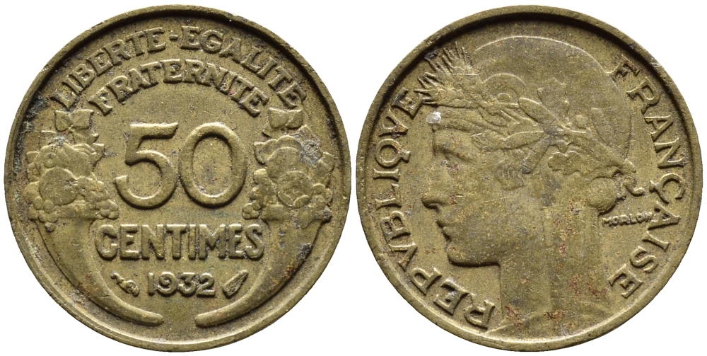 ФРАНЦИЯ 50 САНТИМОВ 1932 ТИП MORLON, OPEN 9, С ЯГОДОЙ KM 849.1, LE FRANC 192.7 алюминиевая бронза 46-239