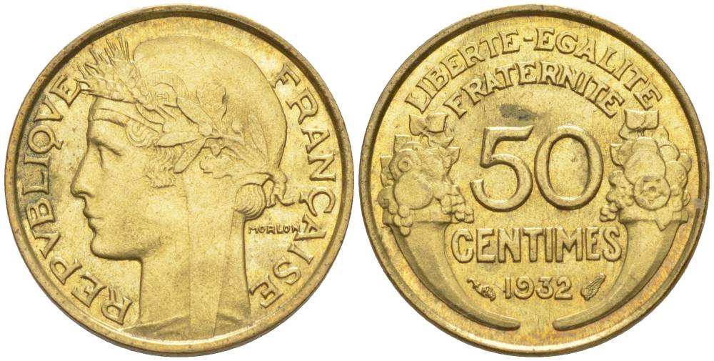ФРАНЦИЯ 50 САНТИМОВ 1932 ТИП MORLON, OPEN 9, С ЯГОДОЙ KM 894.1, LE FRANC 192.7 алюминиевая бронза 44-661