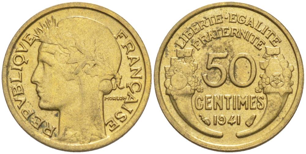 ФРАНЦИЯ 50 САНТИМОВ 1941 ТИП MORLON KM 894.1, LE FRANC 192.18 алюминиевая бронза 44-647