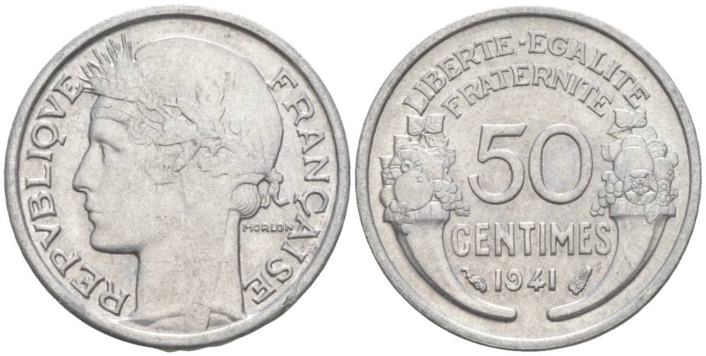 ФРАНЦИЯ 50 САНТИМОВ 1941 ТИП MORLON LOURDE KM 894.1a, LE FRANC 193.2 алюминий 44-158