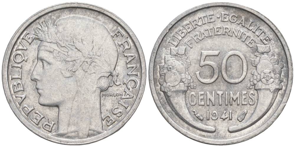 ФРАНЦИЯ 50 САНТИМОВ 1941 ТИП MORLON LOURDE KM 894.1a, LE FRANC 193.2 алюминий 44-235