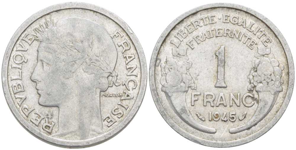 ФРАНЦИЯ 1 ФРАНК 1945 ТИП MORLON KM 885а.1, LE FRANC 221.6 алюминий 212-912