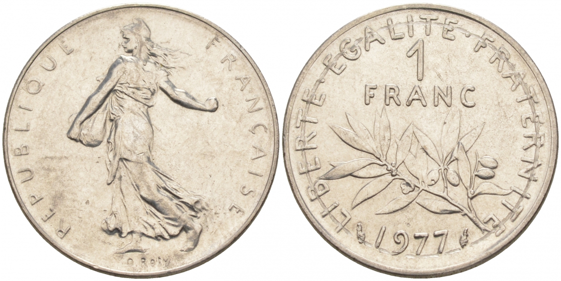 ФРАНЦИЯ 1 ФРАНК 1977 СЕЯТЕЛЬ KM 925.1, LE FRANC 226.22 никель 68-121