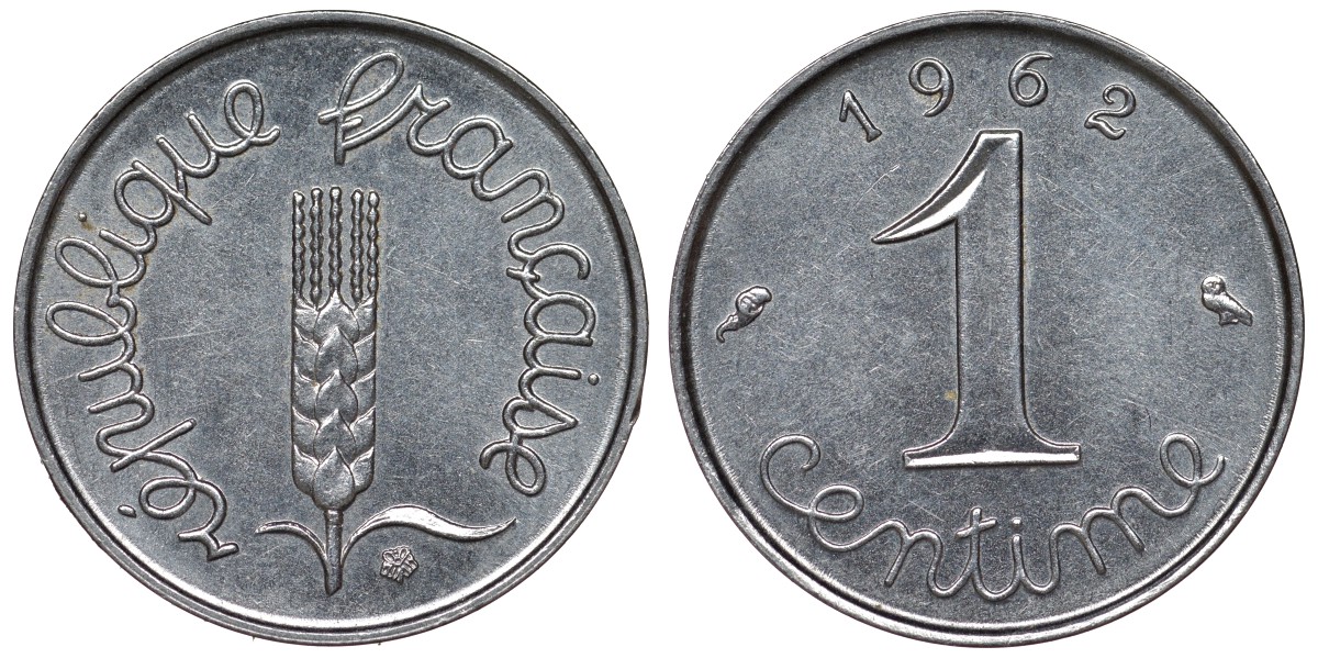Франция 1 сантим 1962 пятая республика KM 928, Le Franc 106.4 нержавеющая сталь 4124-355