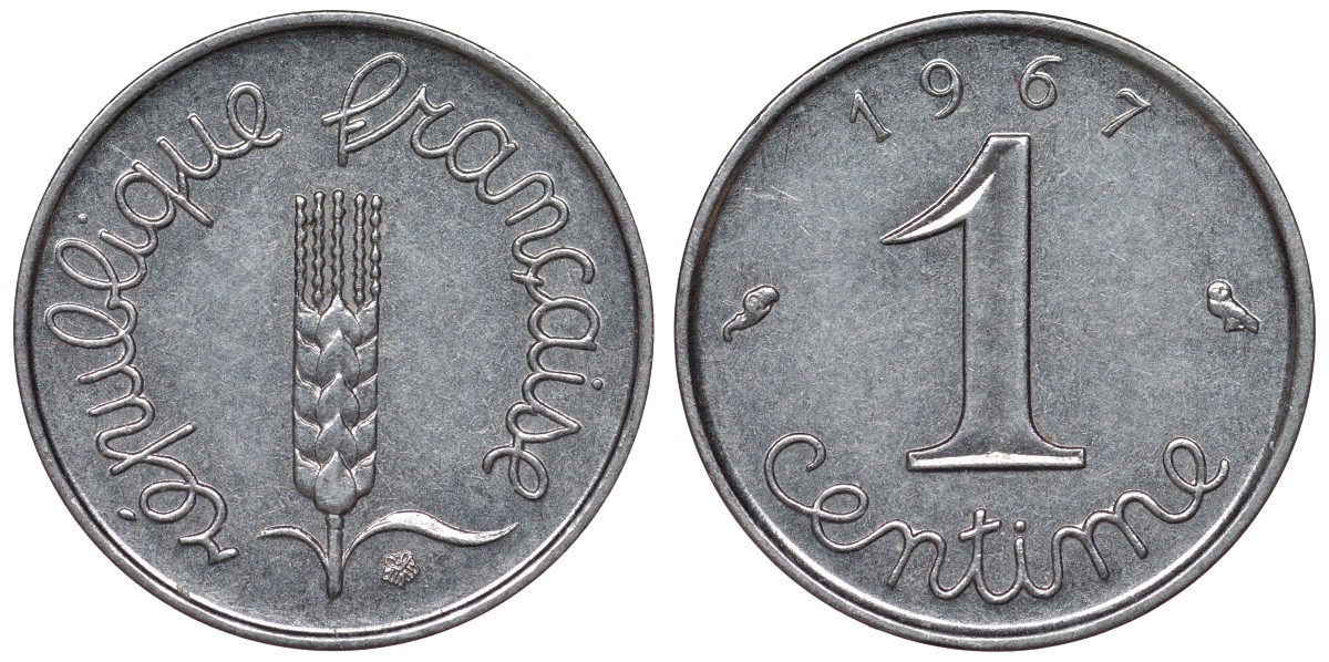 Франция 1 сантим 1967 пятая республика KM 928, Le Franc 106.13 нержавеющая сталь 4124-411