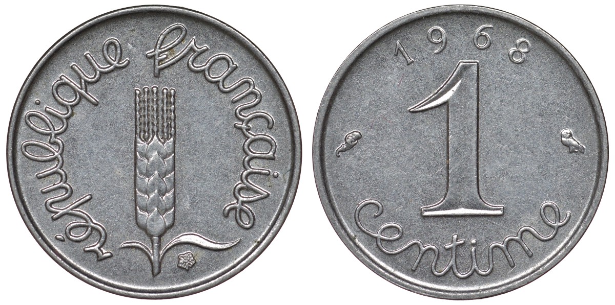 Франция 1 сантим 1968 пятая республика KM 928, Le Franc 106.15 нержавеющая сталь 4124-416