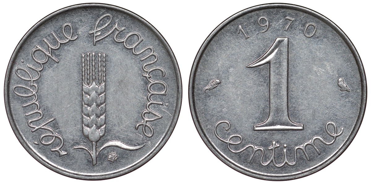 Франция 1 сантим 1970 пятая республика KM 928, Le Franc 106.19 нержавеющая сталь 4124-426