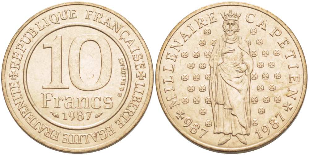 Франция 10 франков 1987 1000 лет первому королю Франции Гуго Капету KM 961 d, Le Franc 371.2 никелированная бронза 215-631