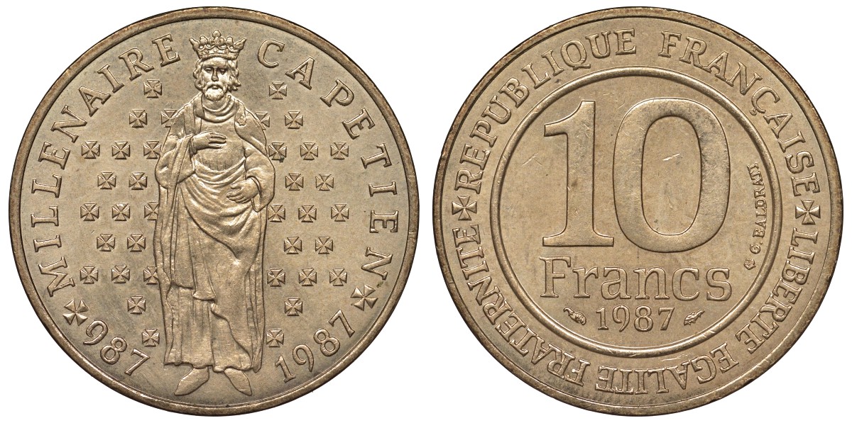 Франция 10 франков 1987 1000 лет первому королю Франции Гуго Капету KM 961 d, Le Franc 371.2 никелированная бронза 4123-635
