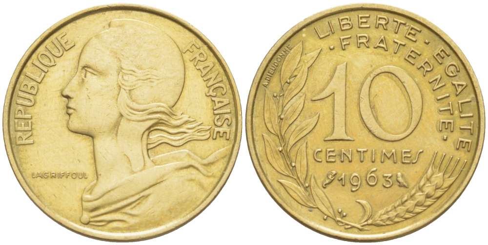 ФРАНЦИЯ 10 САНТИМОВ 1963 ТИП MARIANE KM 929, LE FRANC 144.3 алюминиевая бронза 4519-822