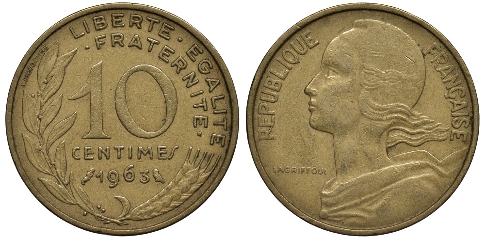 Франция 10 сантимов 1963 тип Marianne KM 929, Le Franc 144.3 медь алюминий никель 186-854