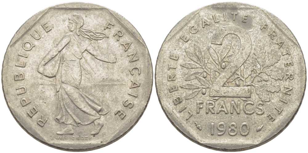 ФРАНЦИЯ 2 ФРАНКА 1980 СЕЯТЕЛЬ KM 942.1, LE FRANC 272.4 никель 111-1112