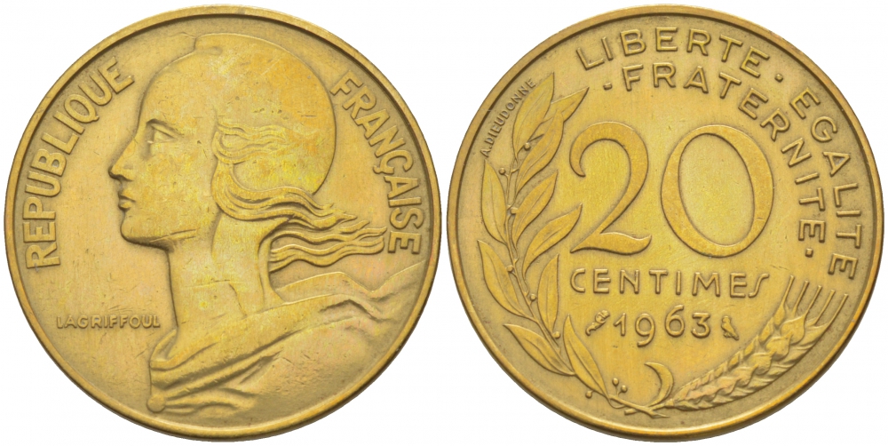 ФРАНЦИЯ 20 САНТИМОВ 1963 KM 930 медь алюминий никель 113-1223