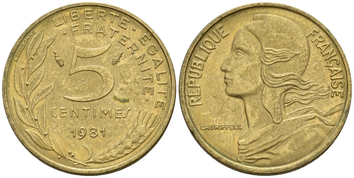 Франция 5 сантимов 1981 KM 933 алюминиевая бронза 4152-433