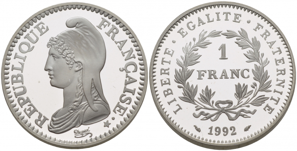 Франция 1 франк 1992 200 лет Французской республике KM 1005 серебро PROOF 1099-2-25