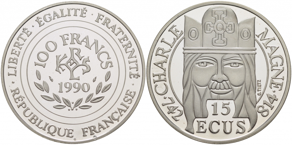 Франция 100 франков - 15 экю 1990 Карл I Великий (742-814) KM 989 серебро PROOF 01-173-25