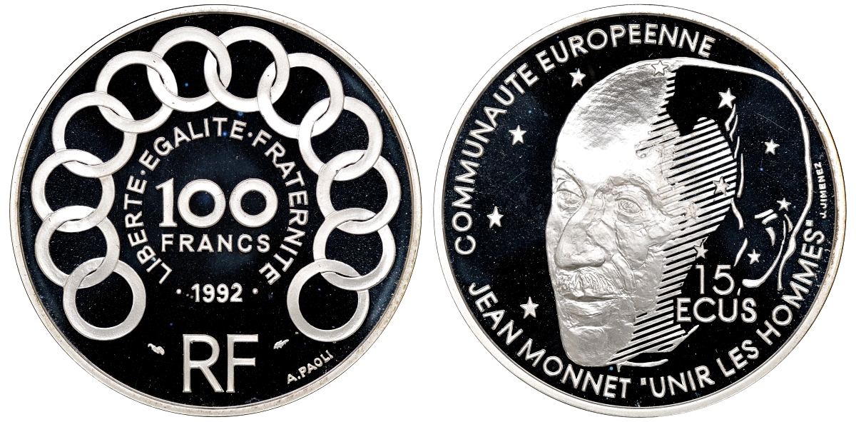 Франция 100 франков - 15 экю 1992 Жан Моне, в оригинальной коробке с сертификатом KM 1012 серебро PROOF 7-5-6-35