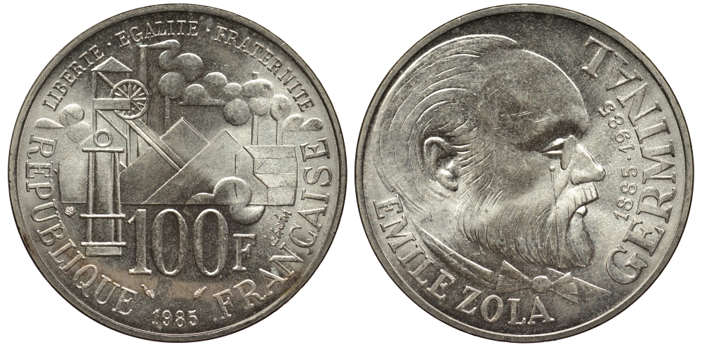ФРАНЦИЯ 100 ФРАНКОВ 1985 100 ЛЕТ СО ДНЯ РОЖДЕНИЯ ЭМИЛЯ ЗОЛЯ KM 957 серебро UNC 1516-1622