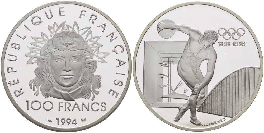 Франция 100 франков 1994 100 лет Олимпийскому движению (1896-1996), дискобол KM 1047 серебро PROOF 1078-1-11