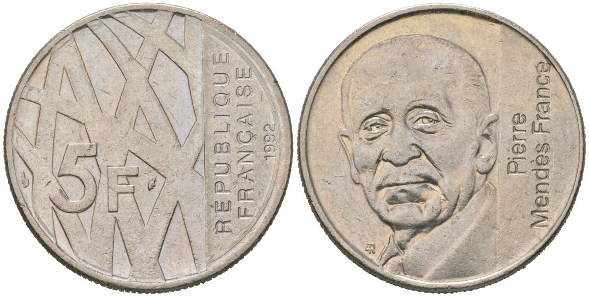 Франция 5 франков 1992 10 лет со дня смерти Пьера Мендеса-Франса KM 1006 никель aUNC 4599-313