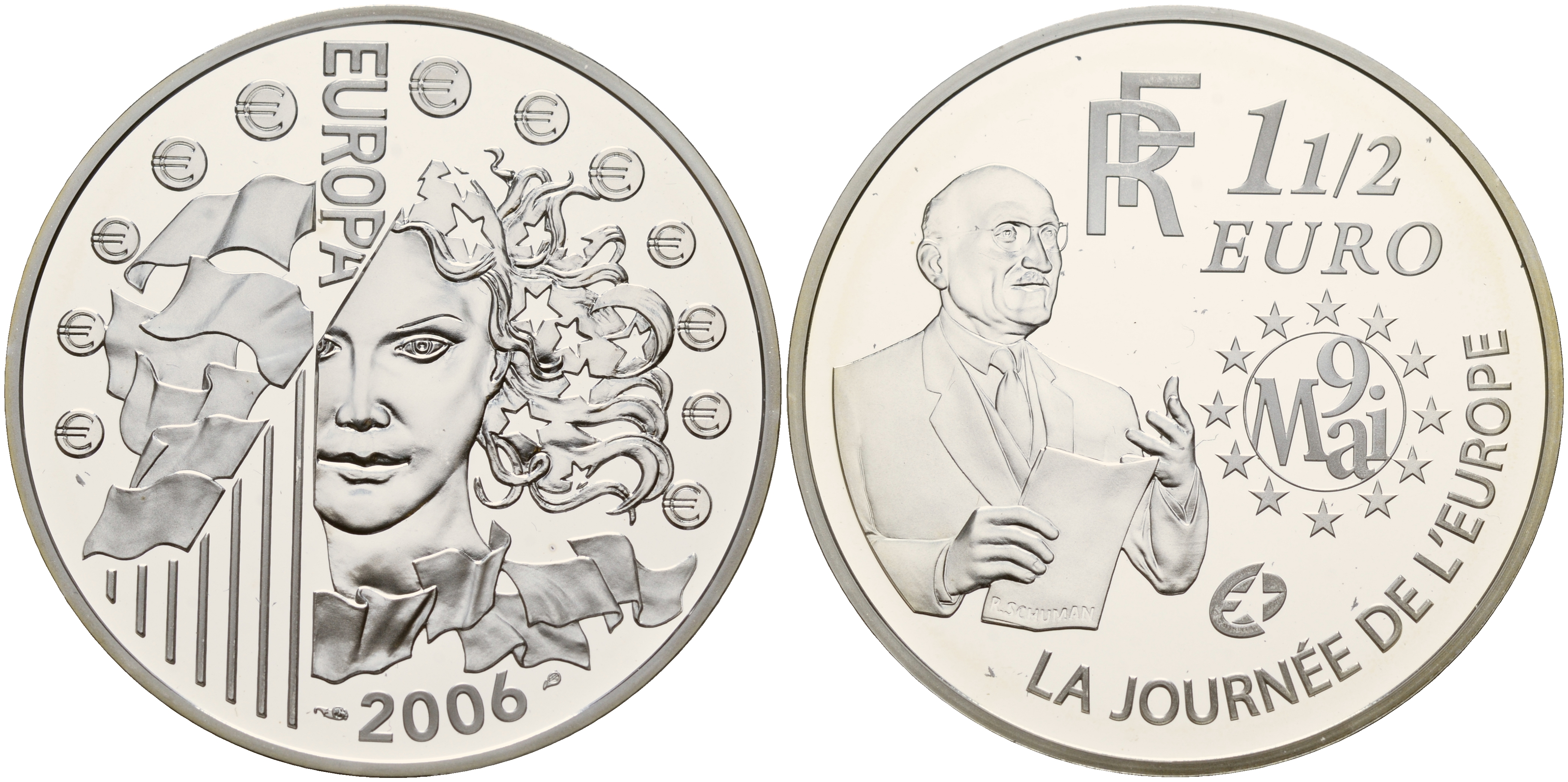 Франция 1 1/2 евро 2006 Декларация Шумана, день Европы 9 мая 1950 года, в оригинальной коробке, с сертификатом серебро PROOF 7-5-4-06