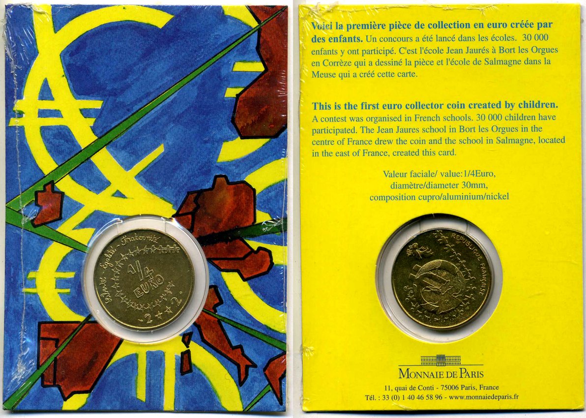 Франция 1/4 евро 2002 детский дизайн, в картонном буклете, сертификат KM 1293 алюминиевая бронза BUNC 5-4-4-19