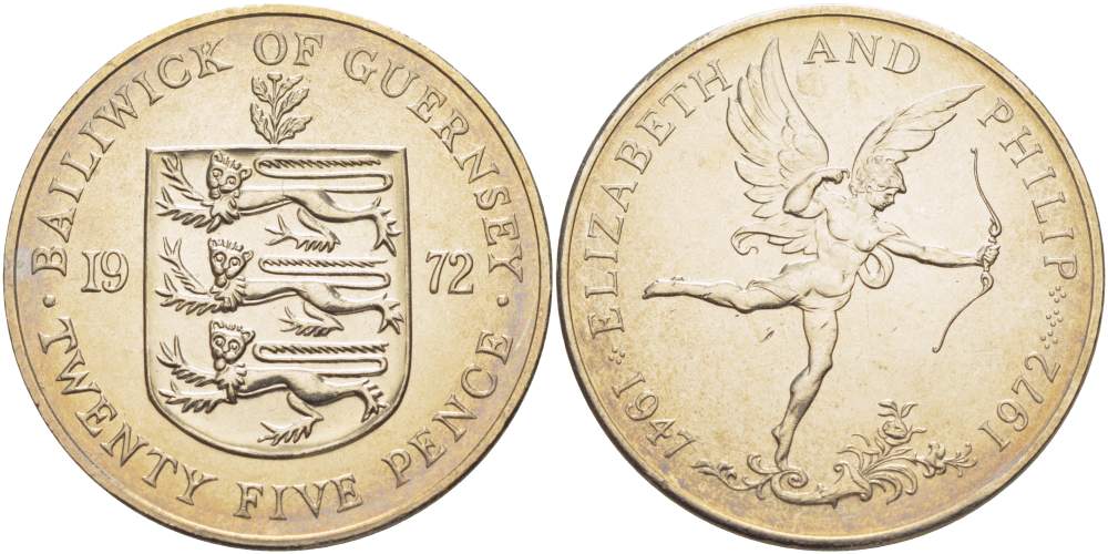 Гернси 25 пенсов 1972 25 лет свадьбы Елизаветы II и Филиппа, амур, в оригинальной пластиковой коробке KM 26 медно-никель UNC 1079-7-11
