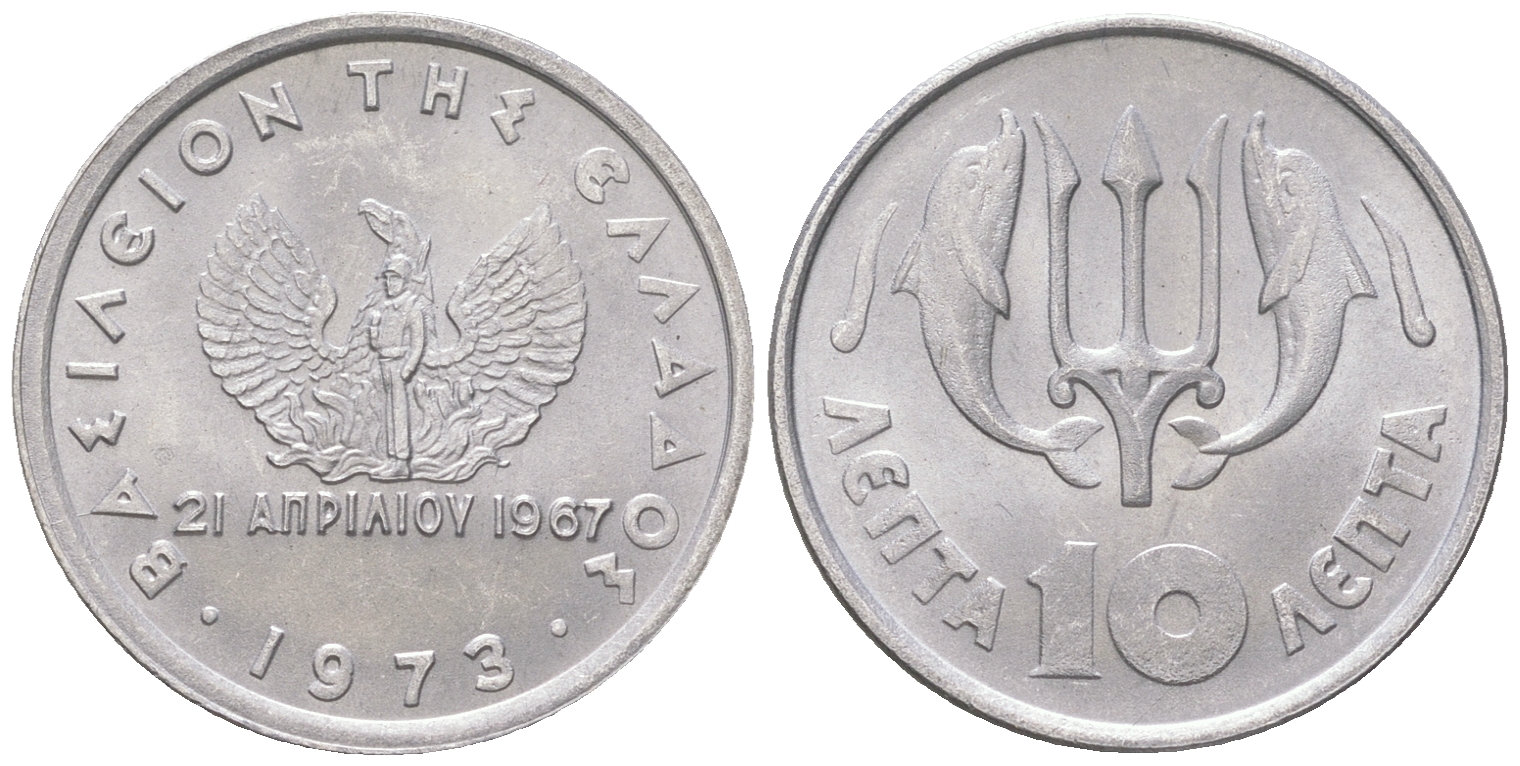 ГРЕЦИЯ 10 ЛЕПТА 1973 КОНСТАНТИН II (1964-1973), 21 АПРЕЛЯ 1967, СОЛДАТ НА ФОНЕ ФЕНИКСА, ВОЕННЫЙ ПЕРЕВОРОТ ЧЕРНЫХ ПОЛКОВНИКОВ, ДВА ДЕЛЬФИНА KM 102 алюминий UNC 212-1037