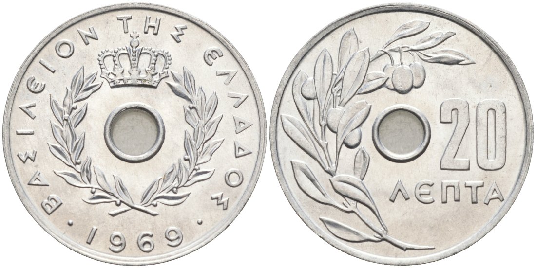 Греция 20 лепта 1969 Константин II (1966-1973), оливковая ветвь KM 79 алюминий 4571-425