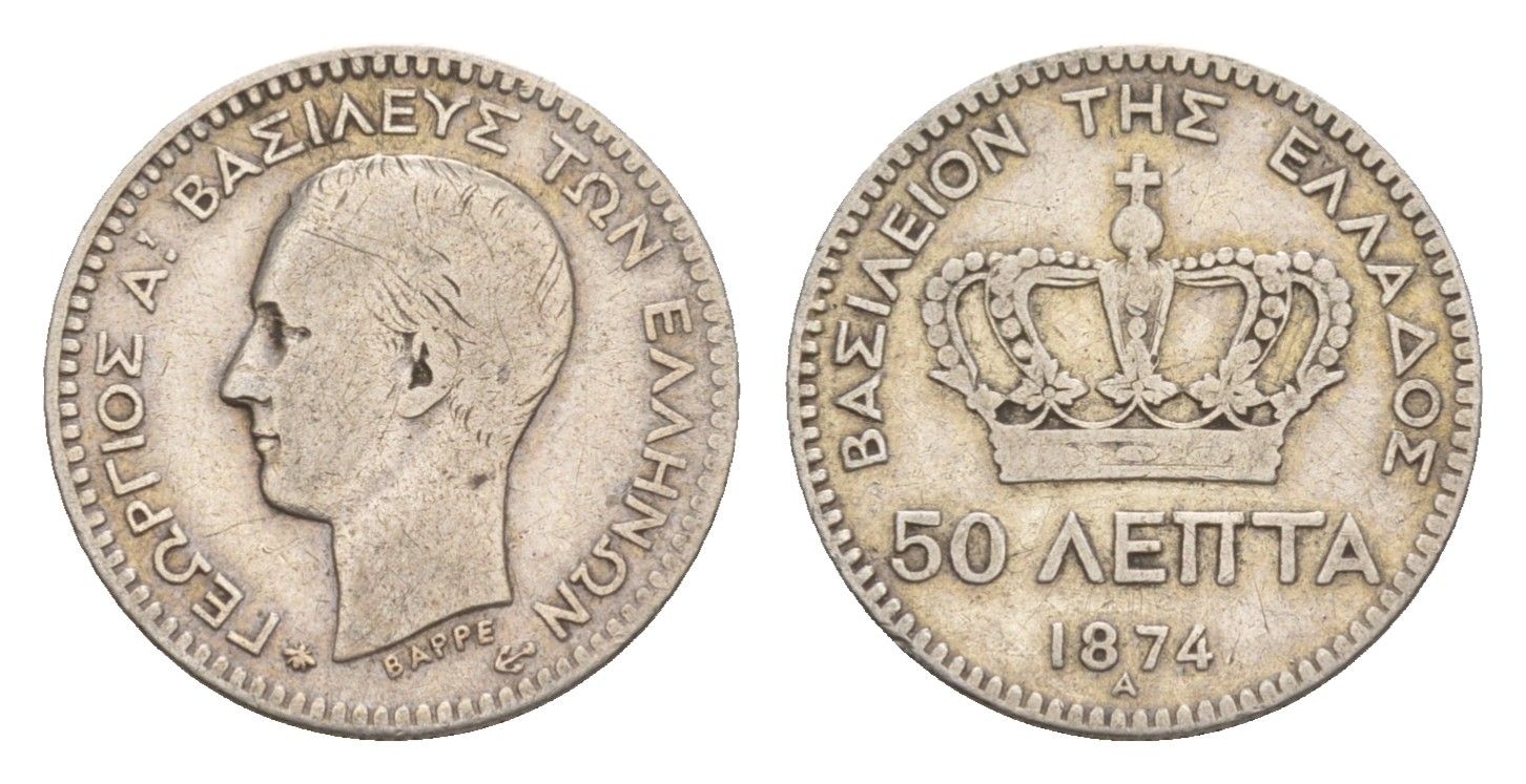 Греция 50 лепт 1874 A, Георг I (1863-1913) KM 37 серебро 4655-428