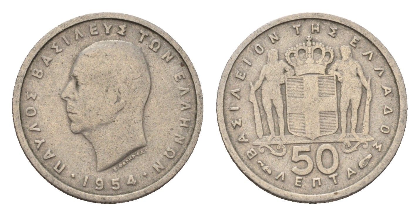 Греция 50 лепт 1954 Павел I (1947-1964) KM 80 медно-никель 4651-955