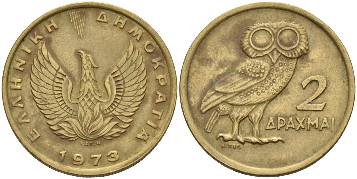 Греция 2 драхмы 1973 сова, феникс в огне KM 108 никель латунь 4126-457