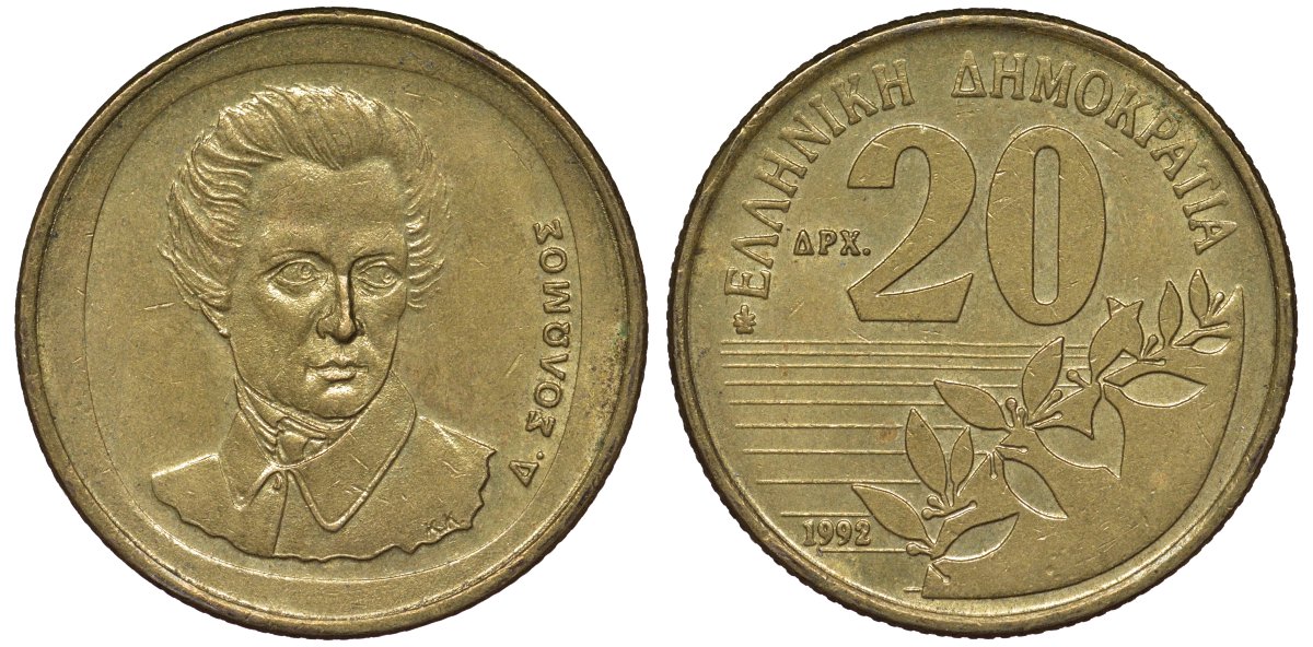 Греция 20 драхм 1992 Дионисиос Соломос KM 154 никель бронза 4131-143