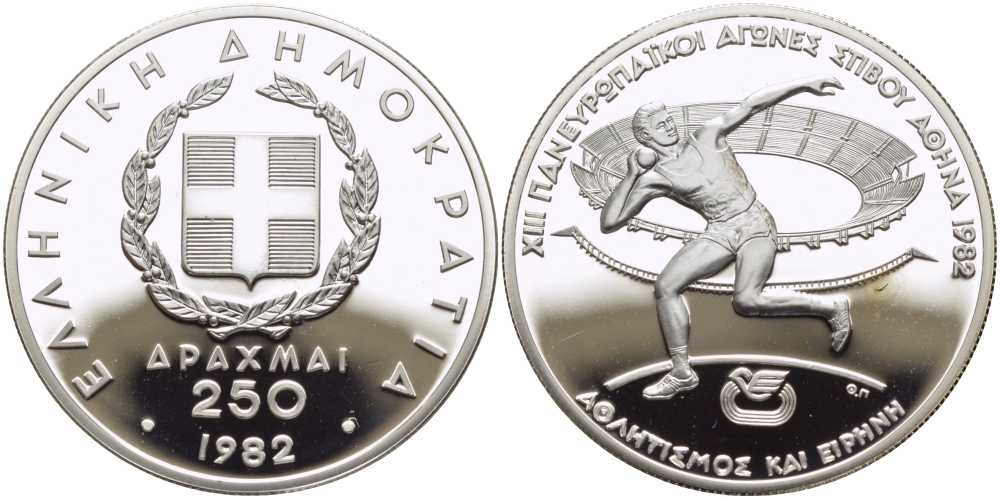 ГРЕЦИЯ 250 ДРАХМ 1982 ПАН-ЕВРОПЕЙСКИЕ ИГРЫ, ТОЛКАТЕЛЬ ЯДРА, ПРОБА 900, ВЕС 14,4 ГР., ТИРАЖ 150000 ЭКЗ. KM 138 серебро PROOF 1080-1-35