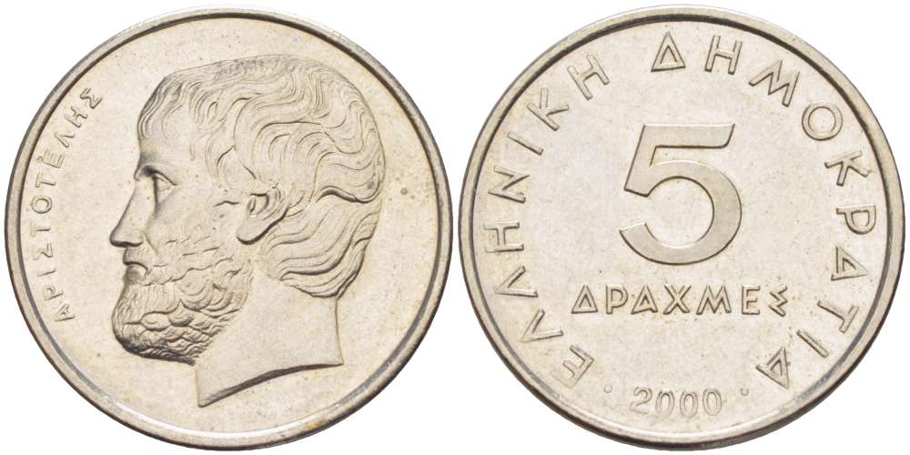 ГРЕЦИЯ 5 ДРАХМ 2000 АРИСТОТЕЛЬ KM 131 медно-никель 4511-1243