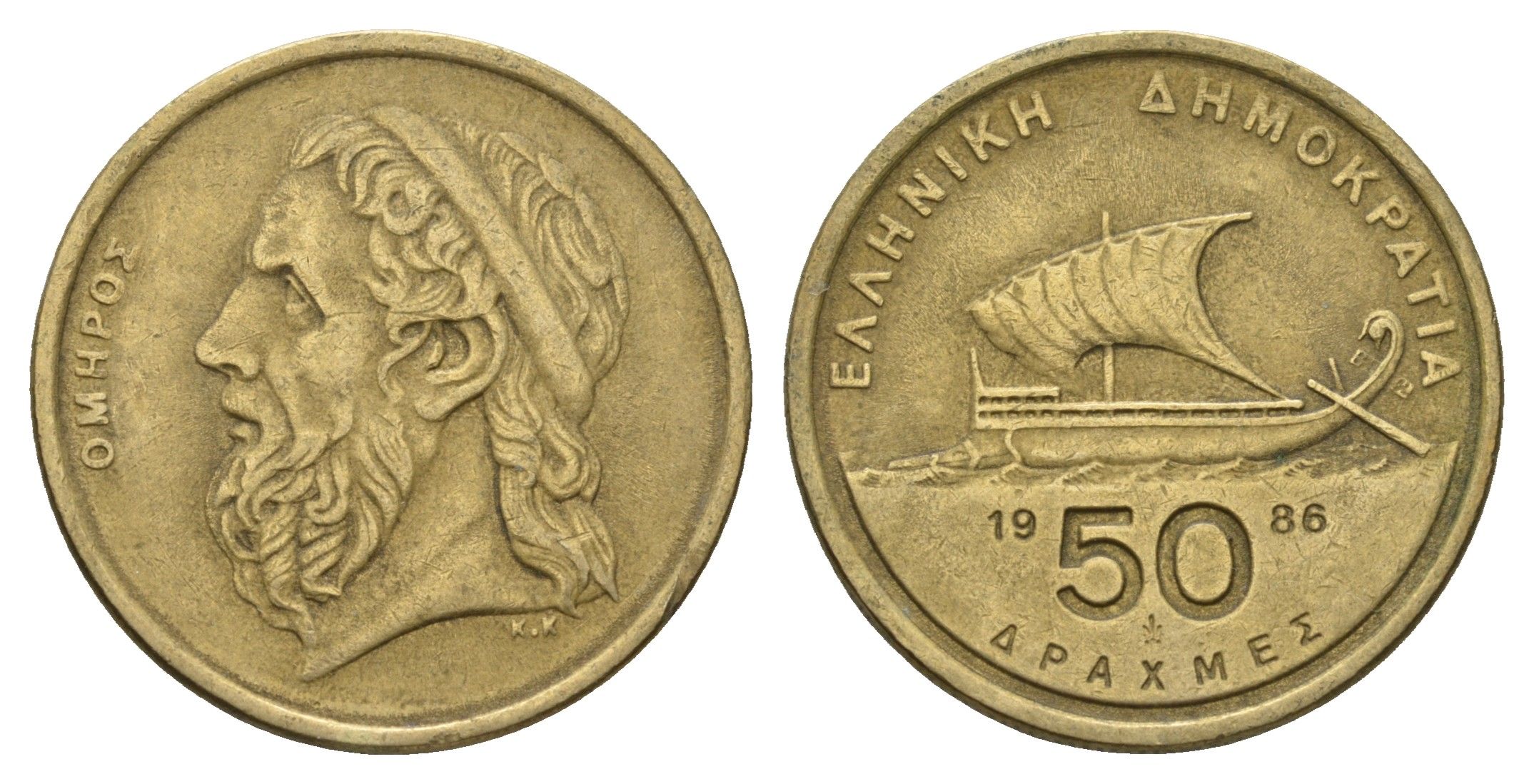 Греция 50 драхм 1986 Гомер, Античный корабль KM 147 алюминиевая бронза 83-2015